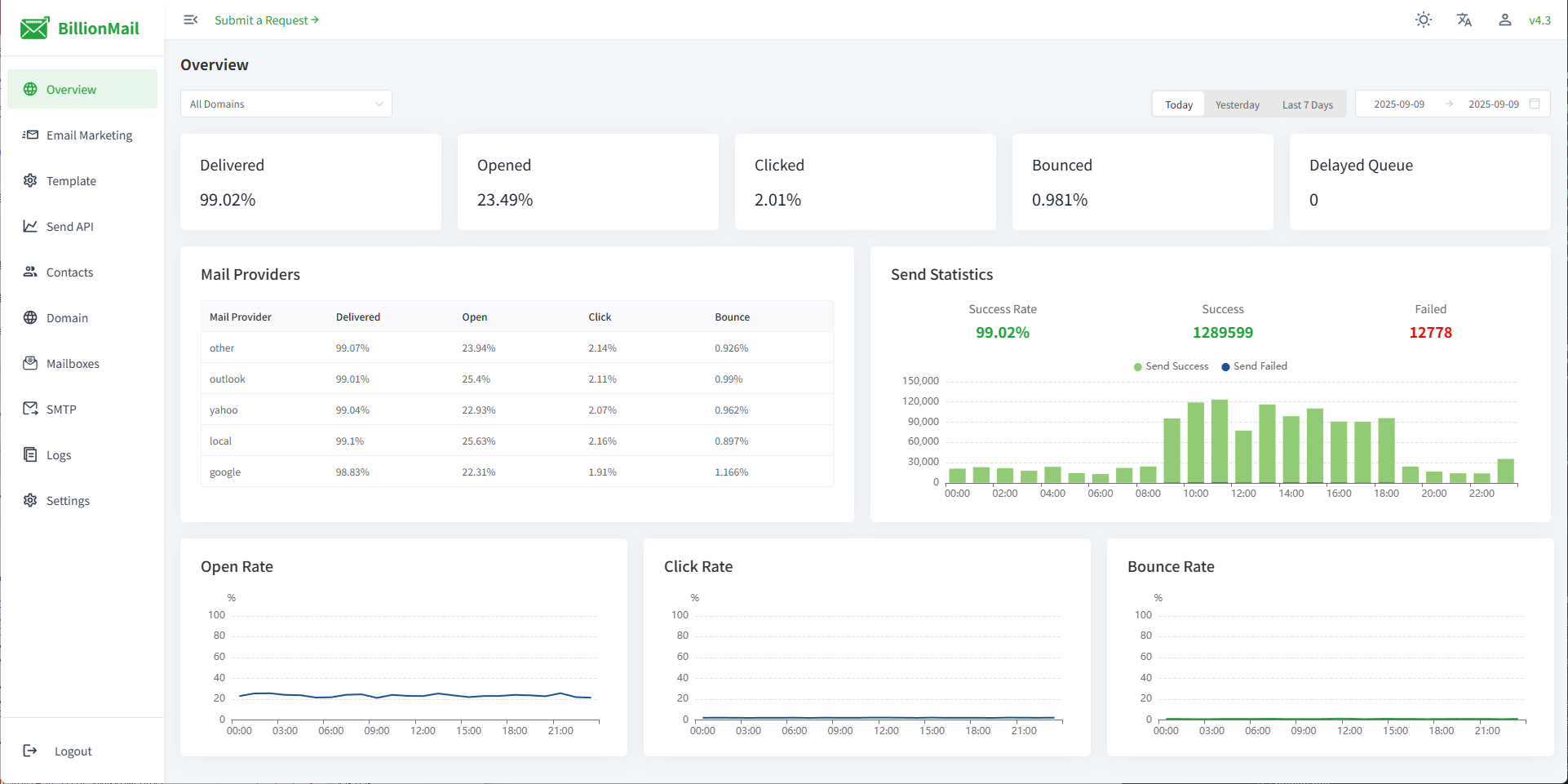 BillionMail gives you open-source MailServer, email marketing — fully self-hosted, dev-friendly, and free from monthly fees.